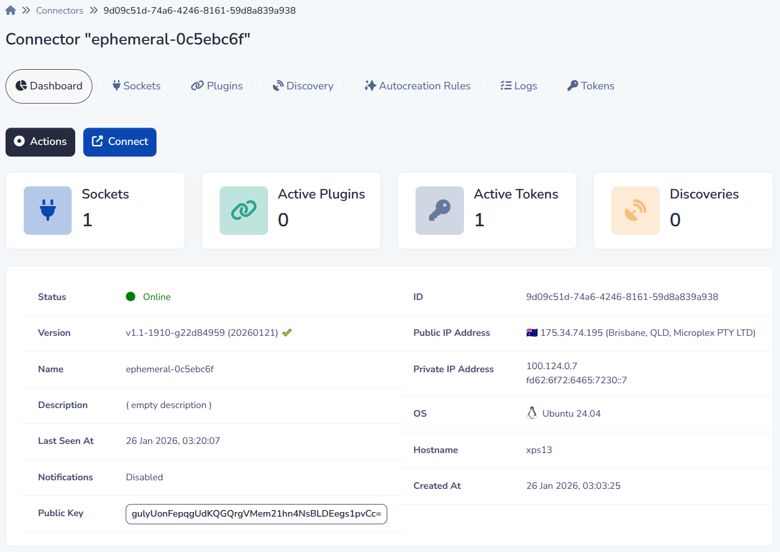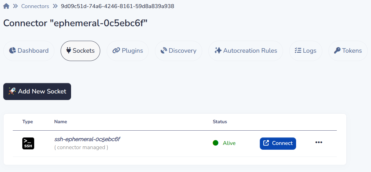 When started in ephemeral mode, the connector registers itself temporarily, enables built in SSH service and exposes it via ssh socket.